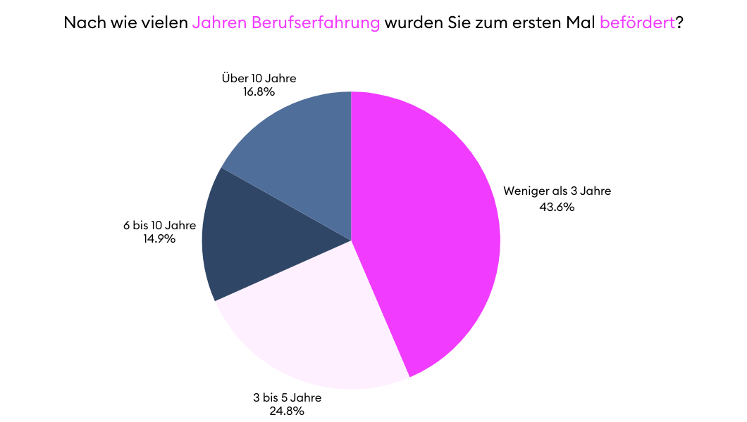 Darüber hinaus wurden 15 % der Teilnehmenden zwischen 6 und 10 Jahren nach ihrem Berufseinstieg befördert, und die verbleibenden 17 % erst nach über 10 Jahren. Tatsächlich verlangen sehr hochrangige Positionen häufig mehr Erfahrung. In manchen Branchen, etwa im Finanzwesen, basieren Beförderungen zudem stark auf der Betriebszugehörigkeit und können je nach Vertrag sogar automatisch erfolgen. Manche Bereiche bieten nur wenige Entwicklungsmöglichkeiten, andere garantieren sie. Der Sektor spielt also eine entscheidende Rolle.