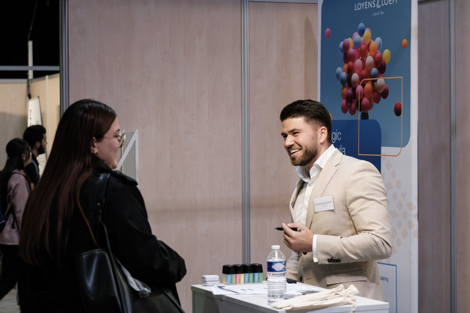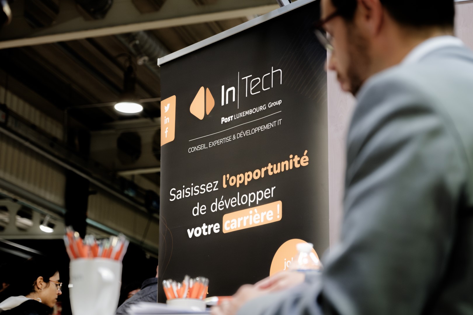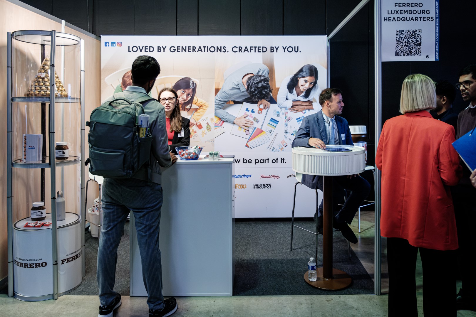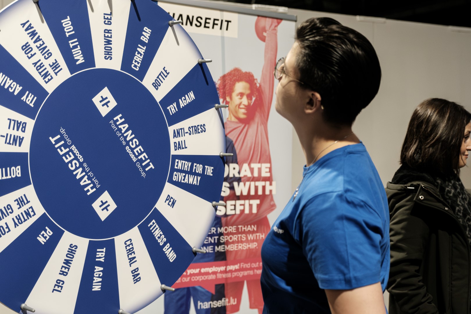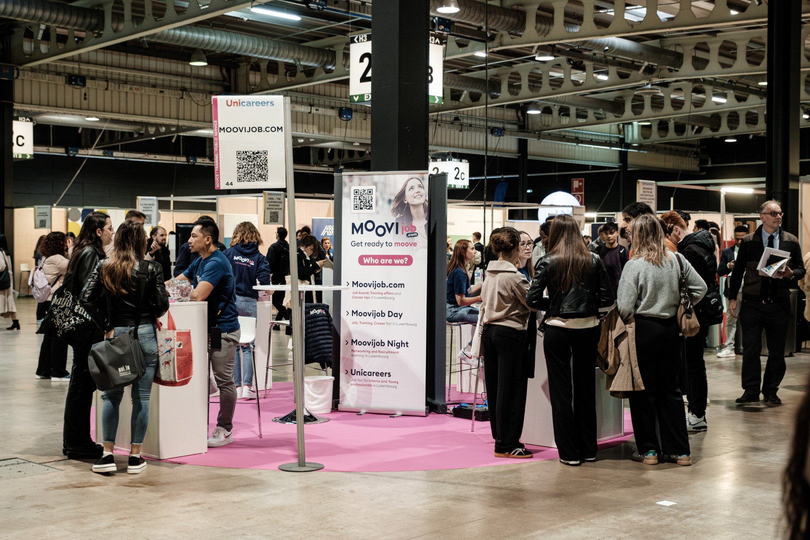 Zusätzlich zum Messeplan erhielten die Besucher den offiziellen Messeguide, der im Luxemburger Wort veröffentlicht wurde. Beim Eintritt hatten die Besucher Zugang zu einer Garderobe, Druckern für ihre Lebensläufe, einem großen Messeplan, einer umfangreichen Wand mit QR-Codes, die alle verfügbaren Stellenangebote am Veranstaltungstag aufzeigten, sowie einer Lounge-Area, in der sie sich stärken konnten. Das Team von Moovijob.com befand sich ebenfalls in der Mitte der Messe am Informationsstand, um alle Fragen der jungen Berufstätigen zu beantworten.