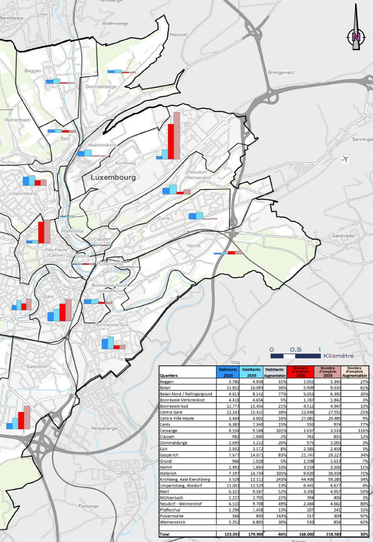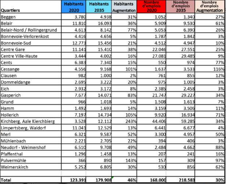 Die Stadt Luxemburg hat eine Prognose zur Entwicklung der Einwohner- und Beschäftigtenzahlen bis 2035 erstellt, anhand derer sich abschätzen lässt, welche Stadtteile sich voraussichtlich am stärksten verändern werden.