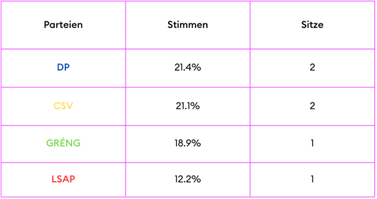 Bei den Europawahlen in Luxemburg 2019 (ebenfalls 6 Sitze verfügbar) waren nach der Stimmabgabe der Wähler die DP, die CSV, die GRÉNG und die LSAP die wichtigsten politischen Parteien, die zur Wahl standen. Hier ein Überblick über die Ergebnisse und die Sitzverteilung nach diesen Wahlen :