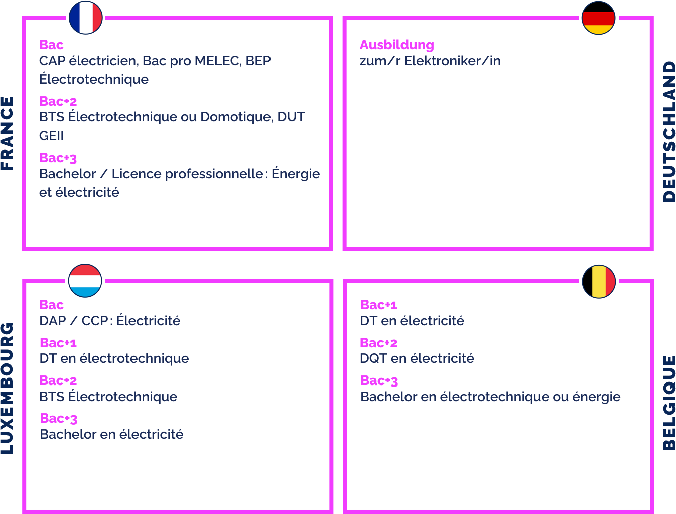Abbildung mit den Qualifikationen in Frankreich, Deutschland, Luxemburg und Belgien für den Beruf des/r Elektrikers/in in Luxemburg