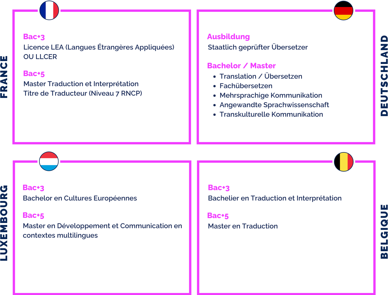Abbildung mit den Qualifikationen in Frankreich, Deutschland, Luxemburg und Belgien für den Beruf des/r Übersetzers/in in Luxemburg