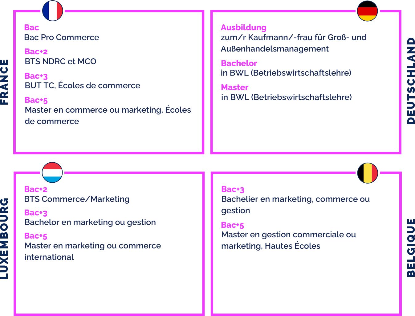 Abbildung mit den Qualifikationen in Frankreich, Deutschland, Luxemburg und Belgien für den Beruf des Vertriebsmitarbeitenden in Luxemburg