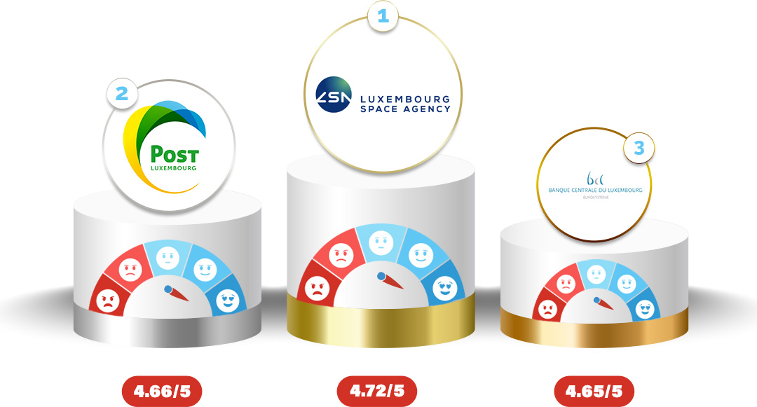 Mit einem Attraktivitätsgrad von 4,72 von 5 schwebt die Luxembourg Space Agency mit einem verdienten ersten Platz im siebten Himmel. Ein gut strukturierter Stand, warme Farben, Animationen und gut organisierte Warteschlangen. Die Erfolgsformel war perfekt. Herzlichen Glückwunsch!