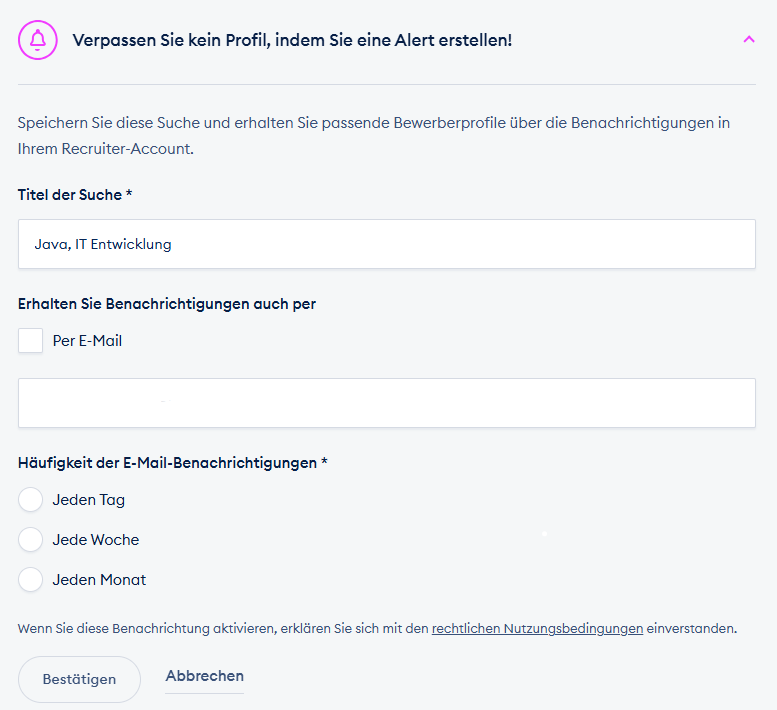- Such-Alert: Sie erhalten per E-Mail eine Benachrichtigung, sobald ein neues Profil Ihren Kriterien entspricht. Die Häufigkeit lässt sich individuell einstellen (täglich, wöchentlich, monatlich).