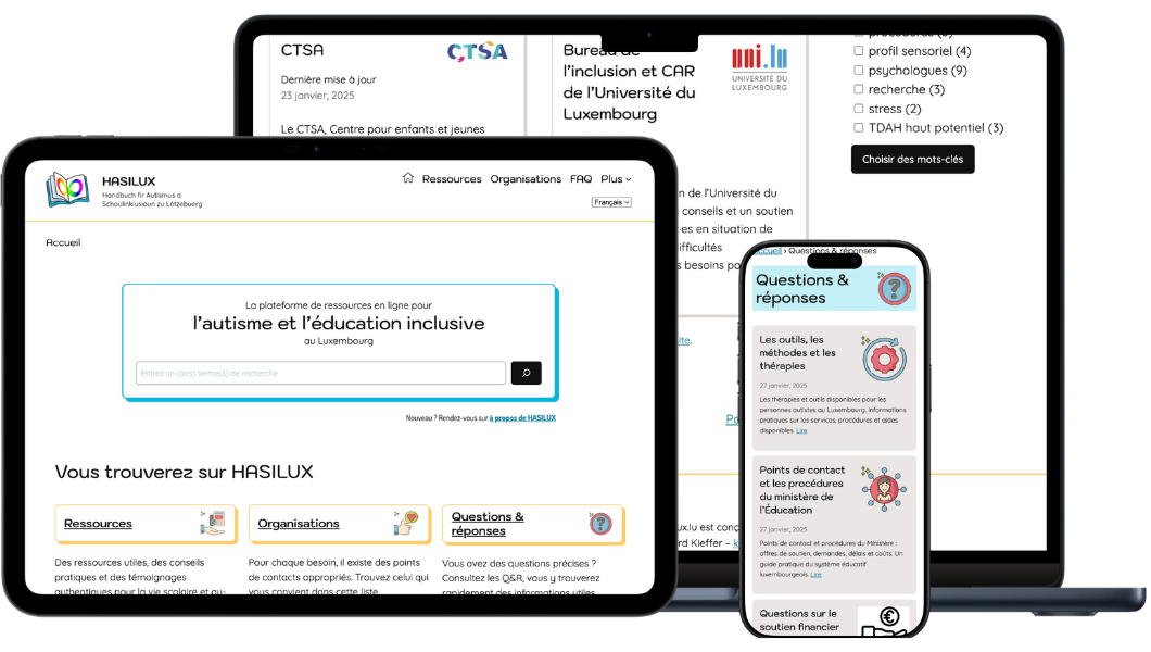 HASILUX (Handbuch fir Autismus a Schoulinklusioun zu Lëtzebuerg) versteht sich in erster Linie als Instrument zur Sensibilisierung, Unterstützung und zum Teilen von Wissen. Die Plattform umfasst drei Hauptbereiche: